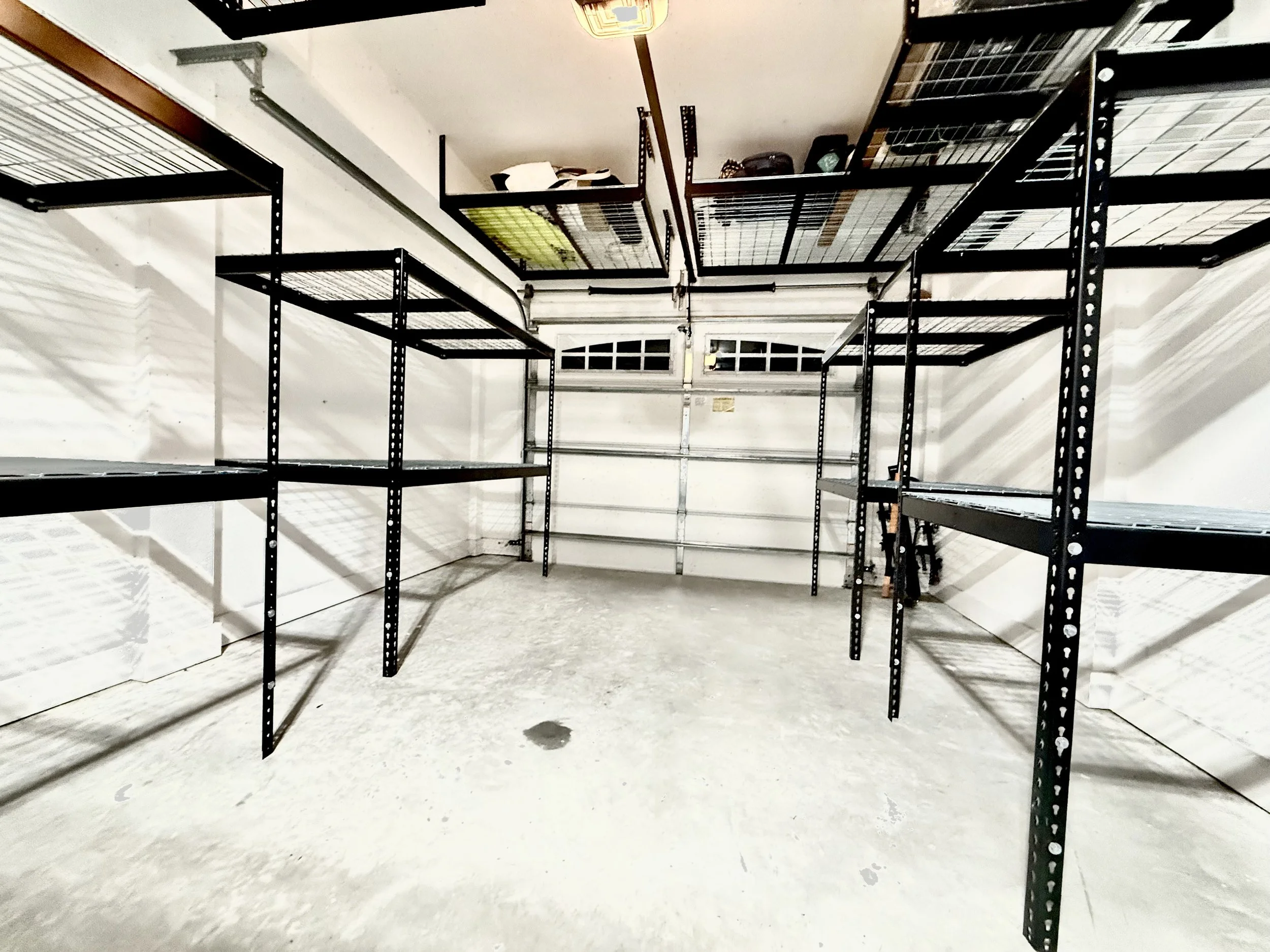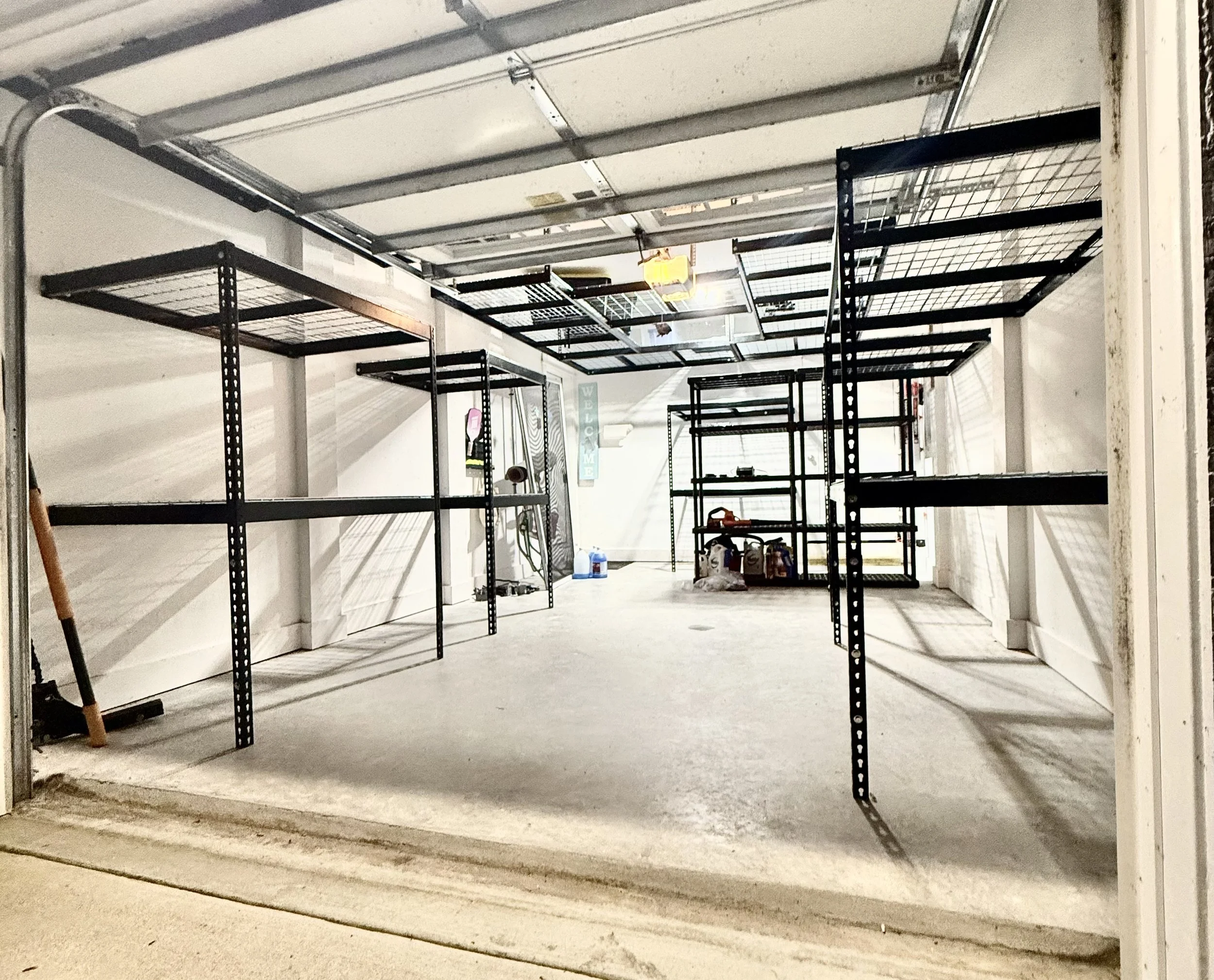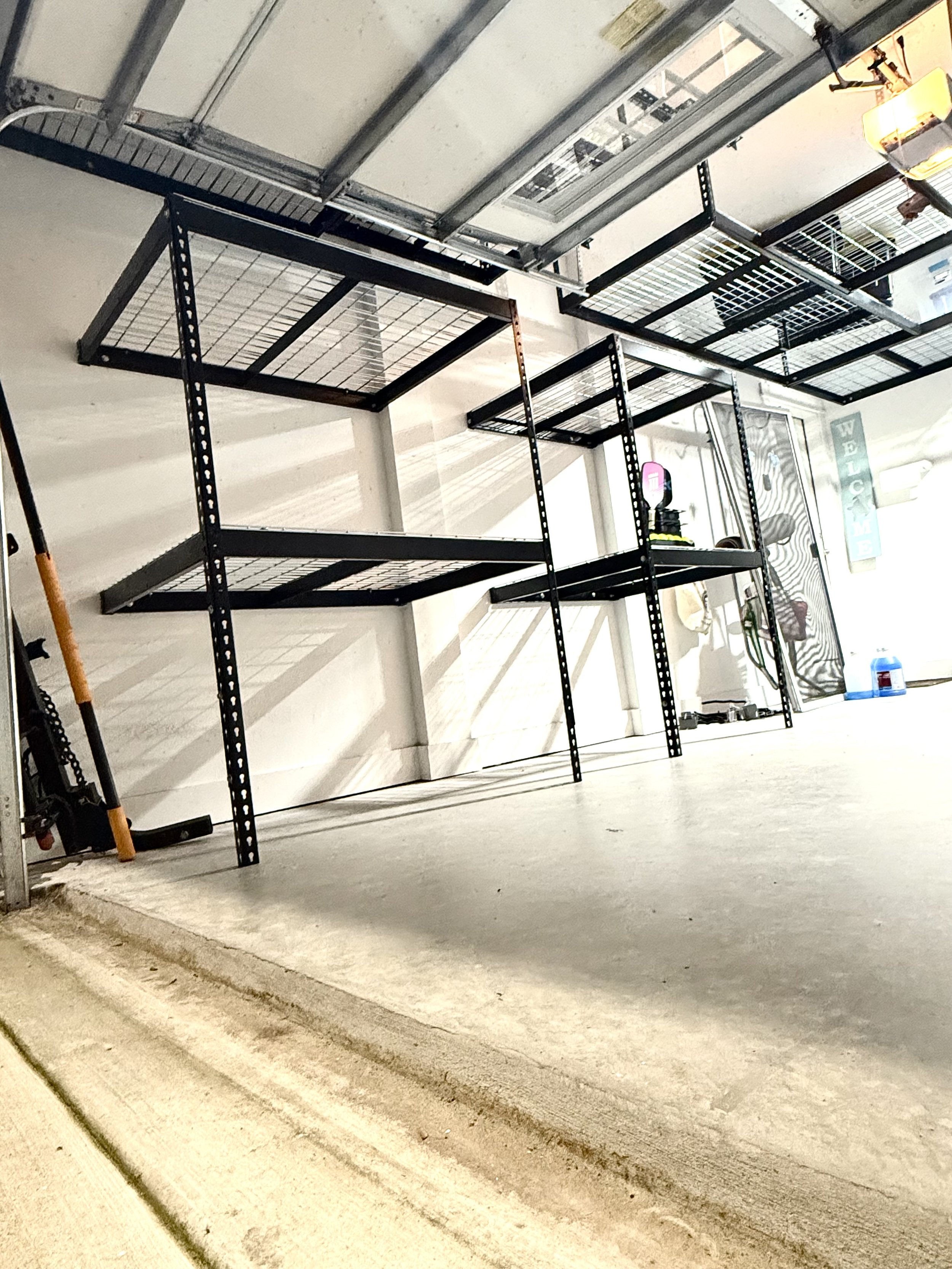 This solution was designed to hold as many standard size totes as possible, while allowing a comfortable walk path to the door. Many customers opt for investing in a one time storage solution in their own home, instead of paying hundreds of dollars per month in storage unit fees. The first two rows of shelving are set at 30” increments, so bins can be double stacked and fit seamlessly between rows. The gaps between shelves are 21” apart. Bikes will be stored from mounts attached to ceiling racks. The wall shelving is designed for storage of ultra heavy items; front brackets transfer the load to the floor.Lastly, a customer in Virginia Beach was looking for a storage solution in a new home