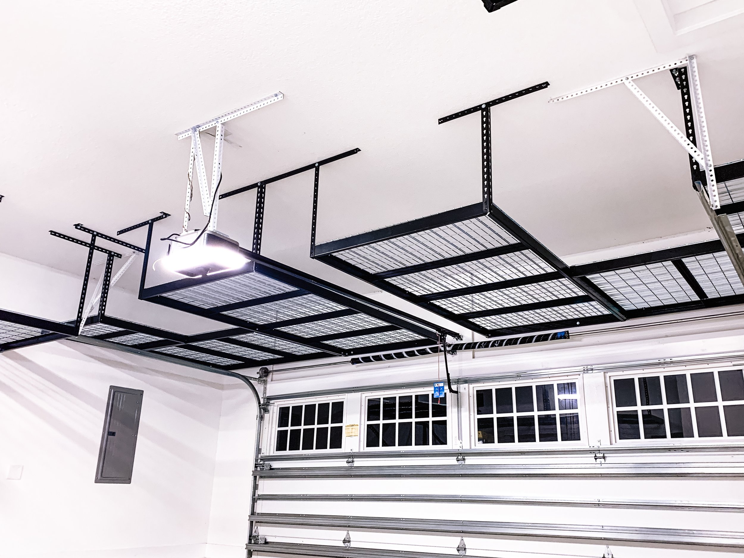 This custom overhead storage platform was designed to maximize space above the garage door. The W-shape design allows easy access to the entire platform. Unlike other options that only bolt to one or two ceiling points, these custom platforms are bolted to the wall on all sides, so most of the load is carried straight to your home's foundation, and the weight on the ceiling is distributed across 10 separate trusses. We only use the highest quality racks. 13 gauge powder-coated steel frames and triple wire decking that bolts to the frame. These features are what separate us from the competition and make for a customized garage storage platform that is rock solid and doesn't swing or shake.Here are some other ideas to inspire your garage transformation
